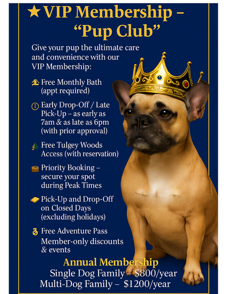 Welcome to our new VIP Pup Club membership program! Starting October 1st of 2025, as we undergo some price increases we would like to treat our clients with a new yearly membership to help clients save money and receive VIP treatment, to get the best out of our services. We appreciate each and everyone of you, and can't wait to continue to upgrade our services to offer the best care to your pets as they deserve.